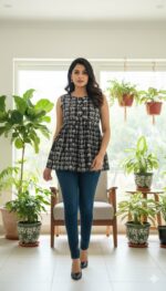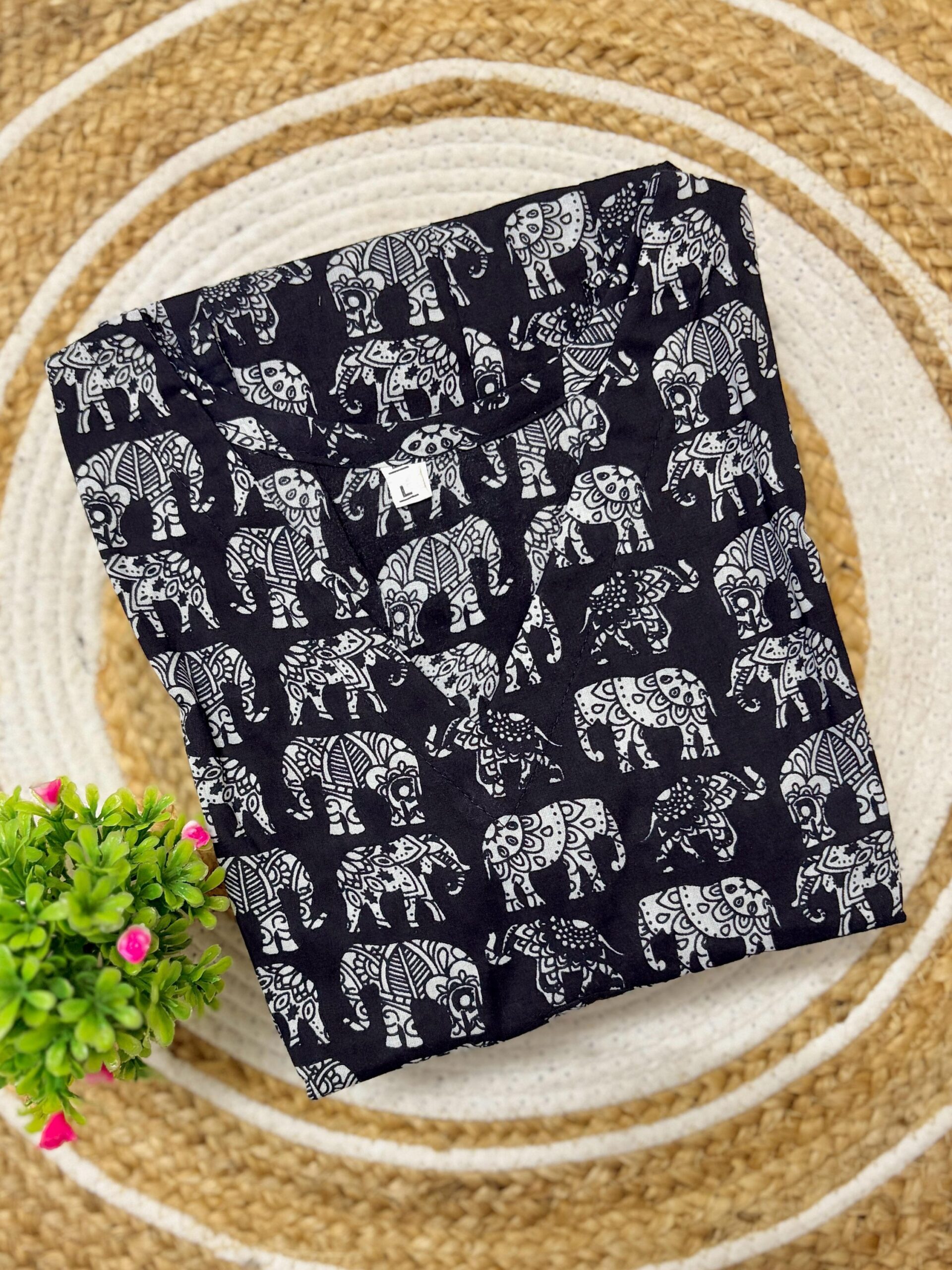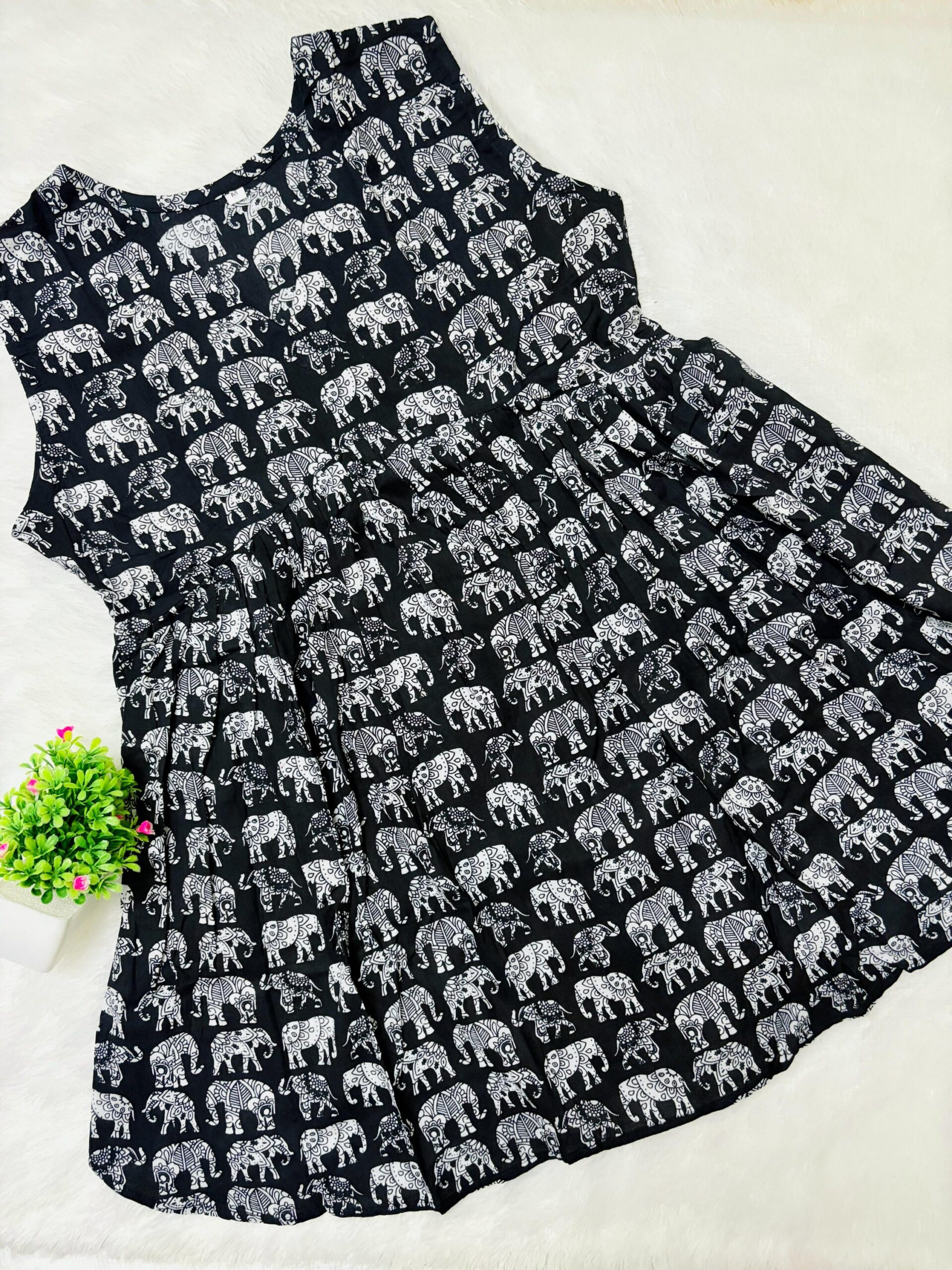 This contemporary peplum top showcases a Black base with white elephant prints. Designed sleeveless with a V-neck and softly flared hem, it offers a breezy and stylish feel for everyday wear.