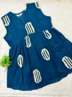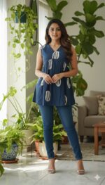 This contemporary peplum top showcases an indigo blue base with abstract white prints. Designed sleeveless with a V-neck and softly flared hem, it offers a breezy and stylish feel for everyday wear.