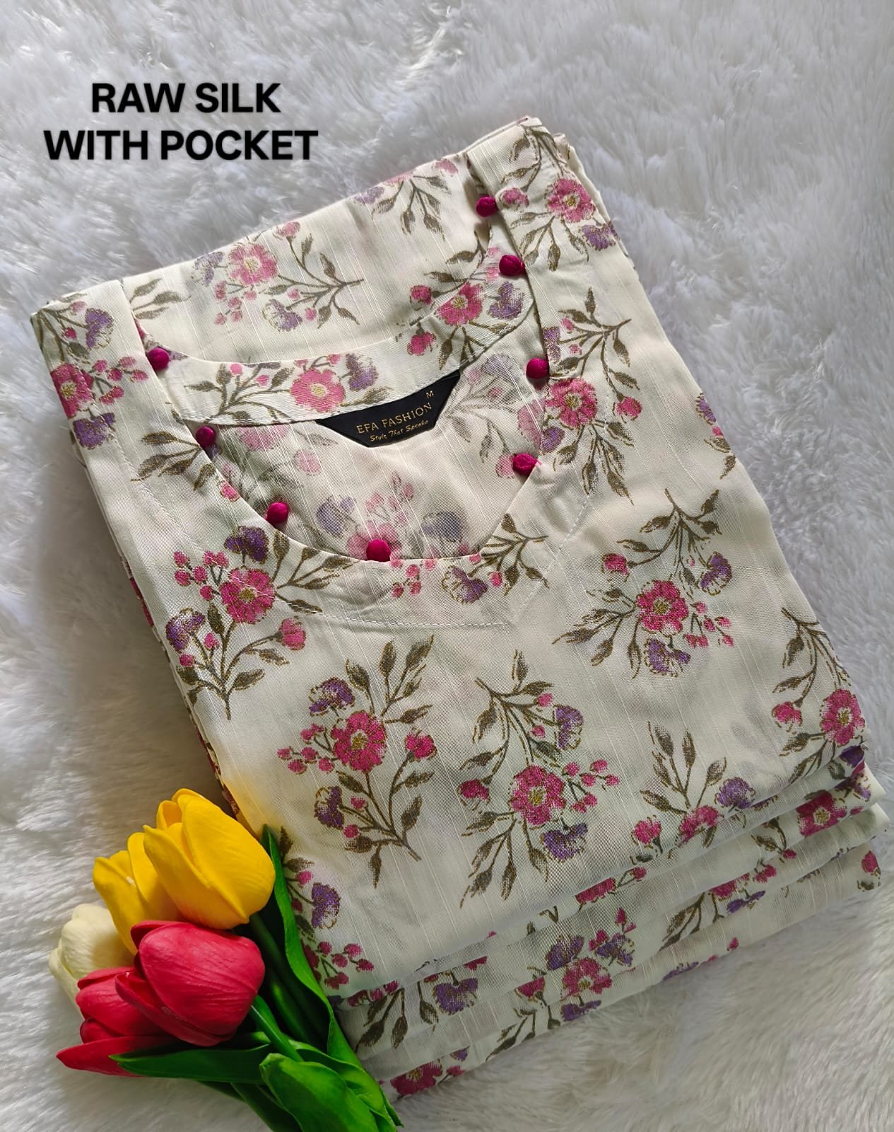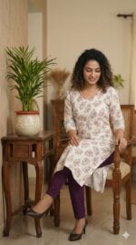Elevate your ethnic wardrobe with this elegant off-white raw silk kurti. Crafted from premium raw silk, it features a delicate lavender and purple floral design that adds a subtle yet striking charm. Perfect for festive occasions, casual outings, or office wear, this kurti combines comfort with sophistication.