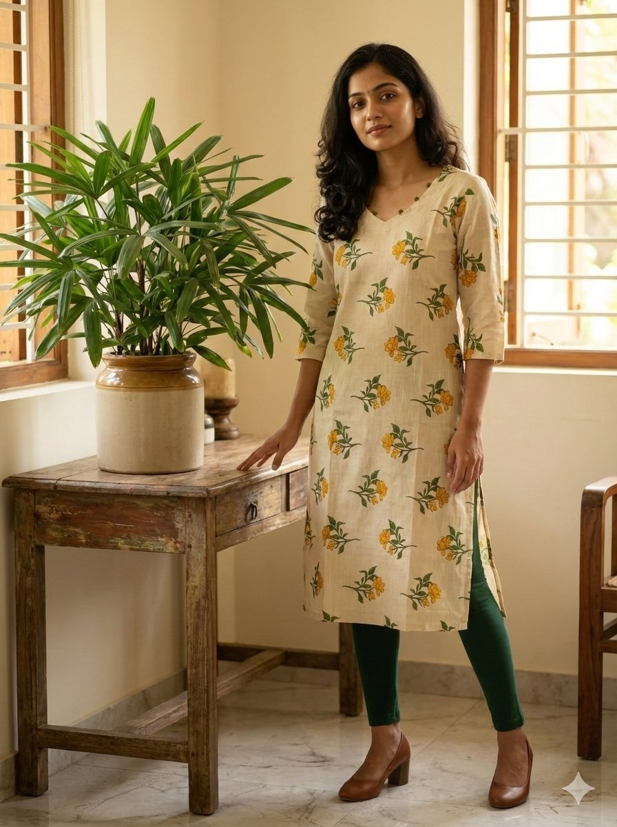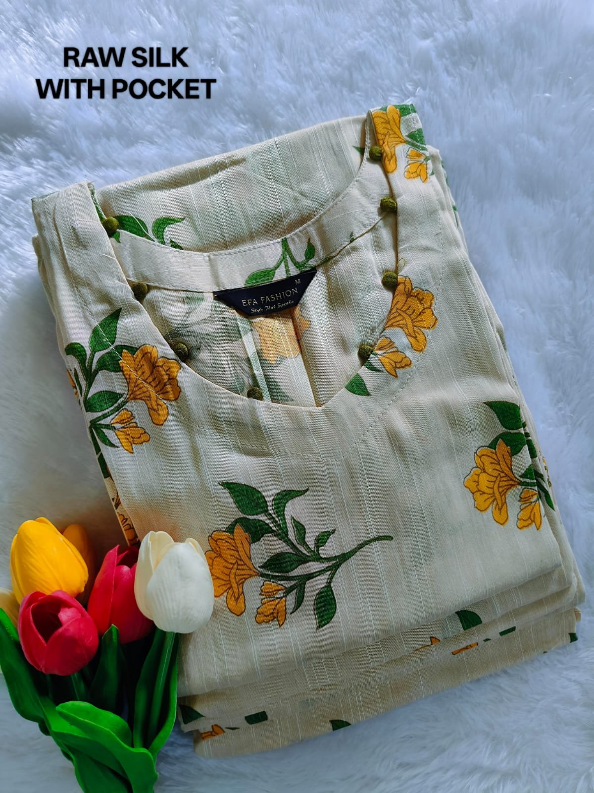 Elevate your ethnic wardrobe with this elegant off-white raw silk kurti. Crafted from premium raw silk, it features a delicate cream with yellow floral design that adds a subtle yet striking charm. Perfect for festive occasions, casual outings, or office wear, this kurti combines comfort with sophistication.